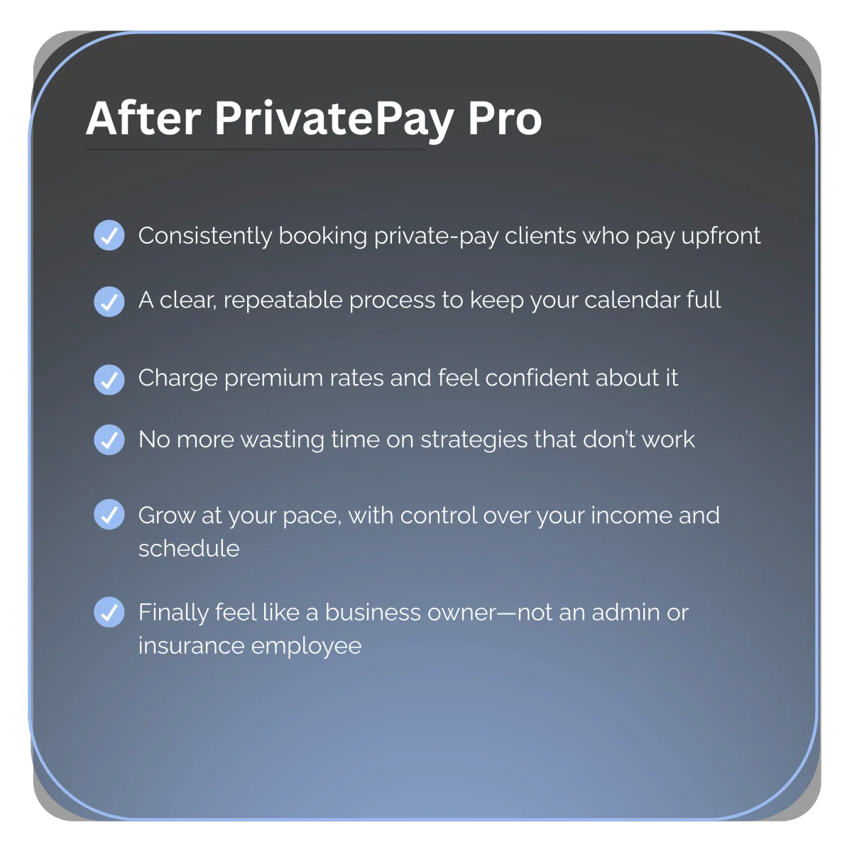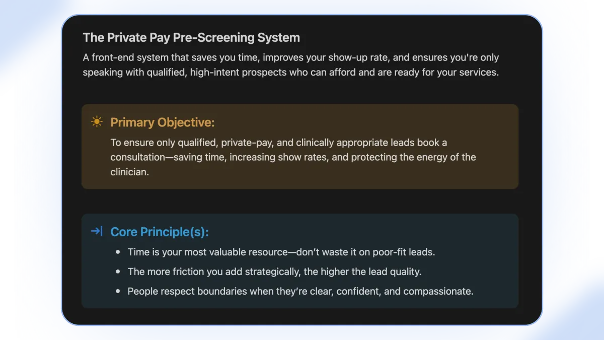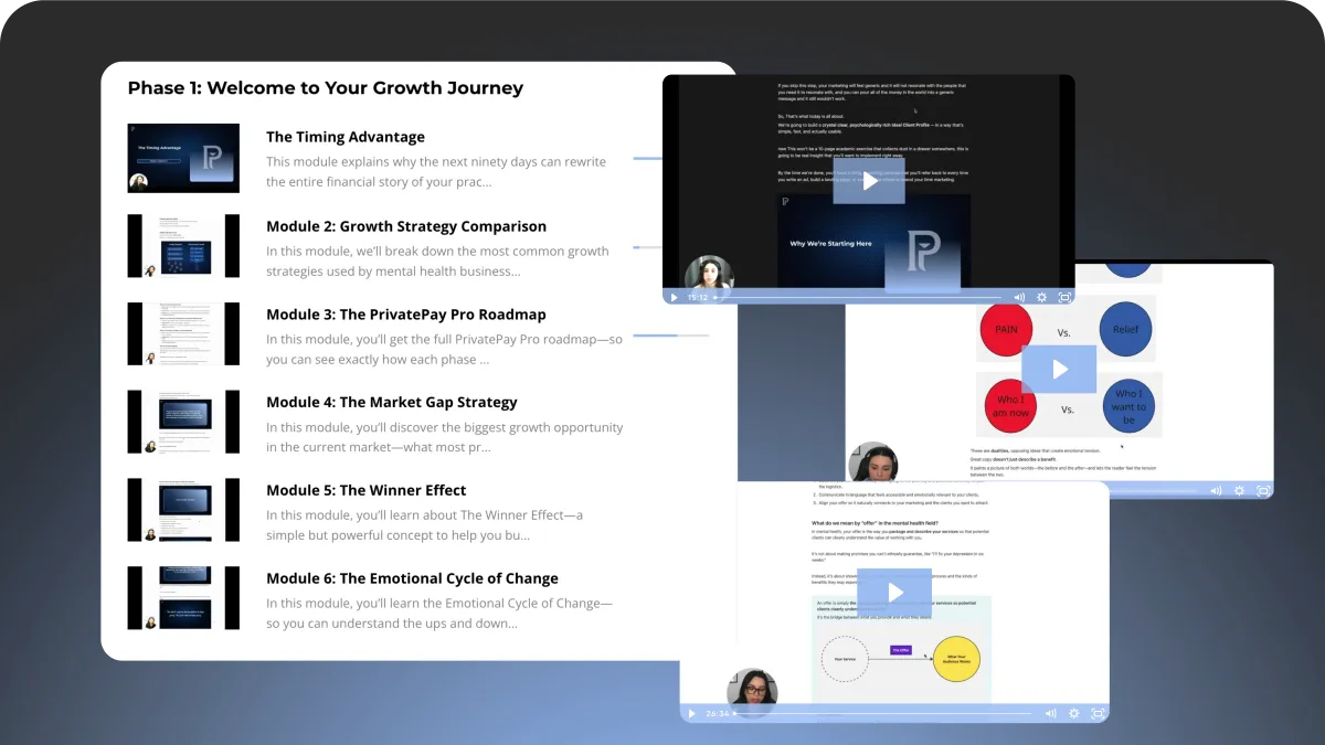 PrivatePay Pro is a 90-day system designed to help you consistently attract and convert premium, private-pay clients. You’ll get access to our complete client acquisition system—done-for-you templates, scripts, workflows, and our proven 3-phase growth map. We guide you step-by-step so you're never left guessing.